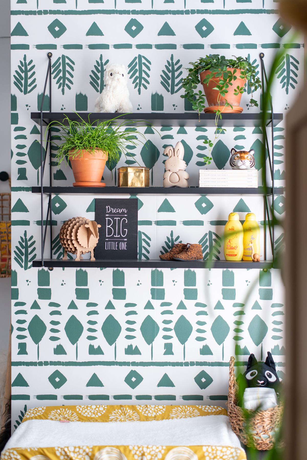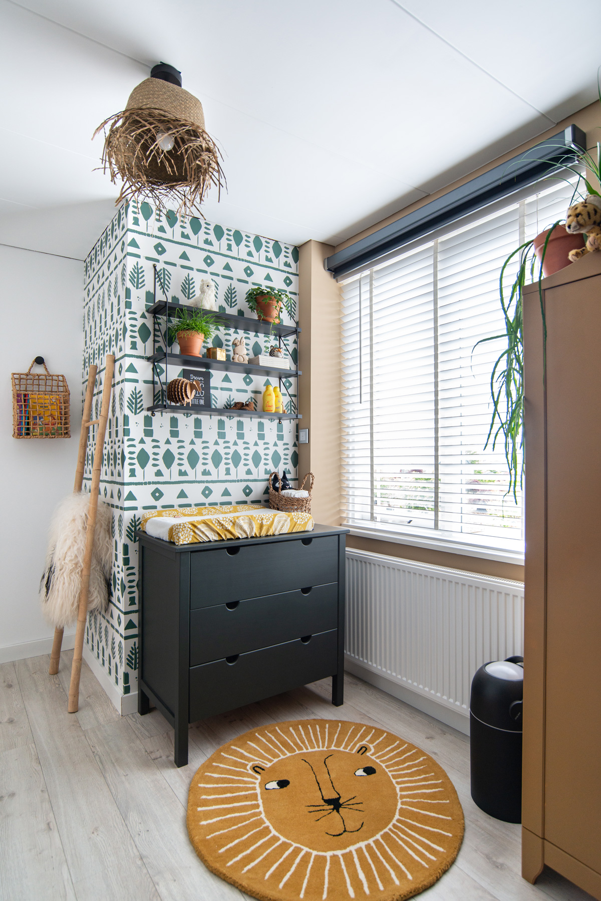 Dit is de andere kant van de kamer. Dit muurtje leende zich perfect voor de commode. Eentje van marktplaats en ook weer met verf van Vestingh een kleurtje gegeven in Soft Black 282. Voor dit gedeelte was ik op zoek naar een behang om deze 2 muren wat spannender te maken. Op Instagram kwam ik bij Roomblush terecht en daar hadden ze de perfecte match! Een etnische print in een groene kleur die precies aansluit bij de muurkleur. Ik ben heel benieuwd wat onze mini hiervan gaat vinden ;-).