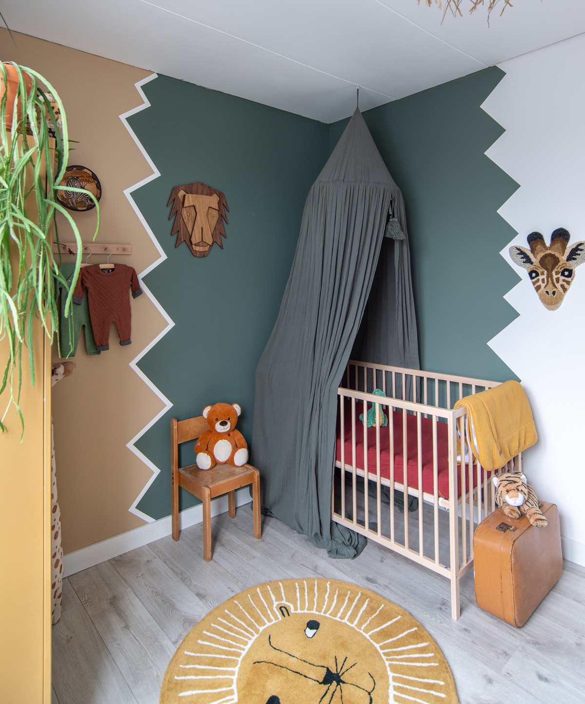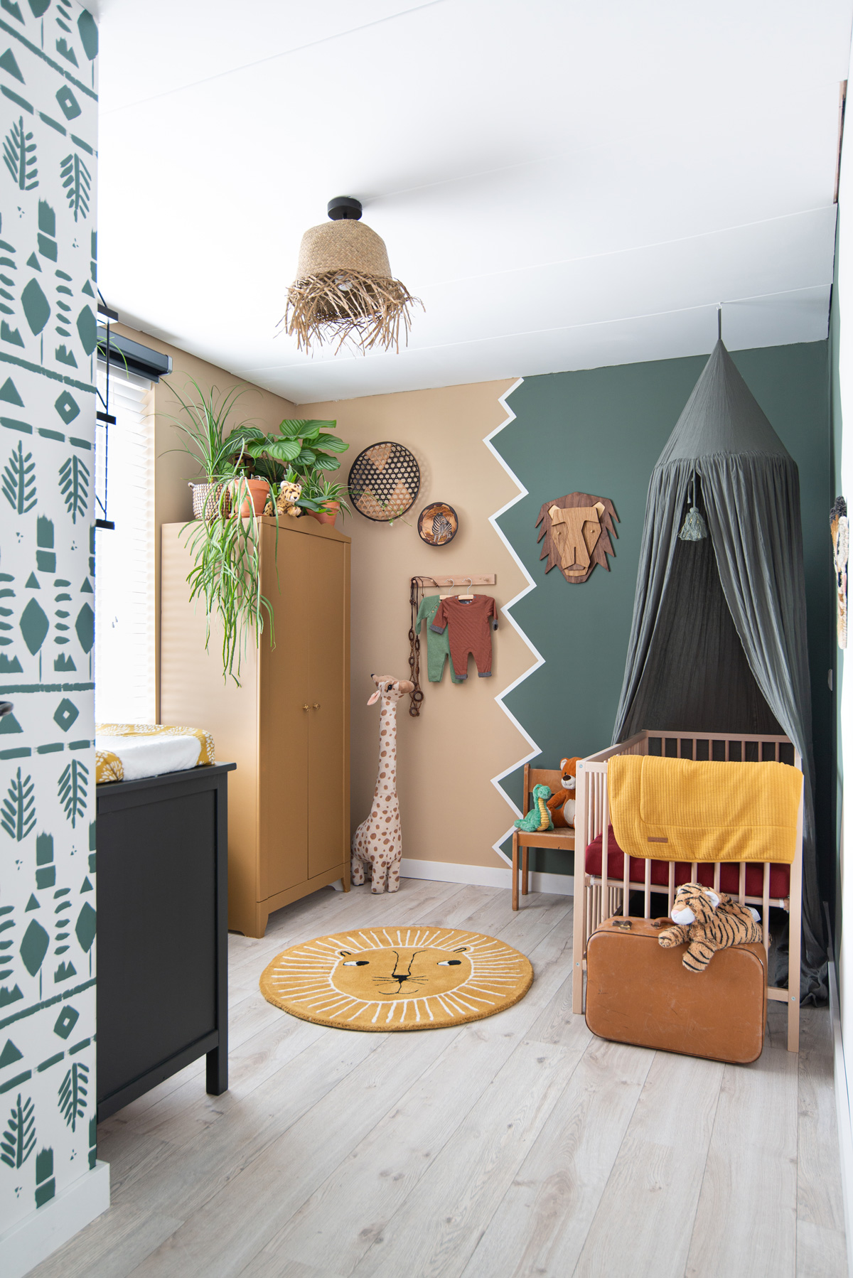 In mijn vorige blog zagen jullie al welke kleuren en materialen ik zou gaan gebruiken. De liefde voor etnische prints is ook in de babykamer toegepast. In de vorm van verf én in een behangetje (die zien jullie verderop duidelijker). Ik zag vaak een lambrisering met verf in de vorm van bergen etc. Maar ik wou het net even anders. Een verticale “rommelige” zigzag splitst de kamer in 2 gedeeltes. En ik ben heel blij hoe dat heeft uitgepakt!