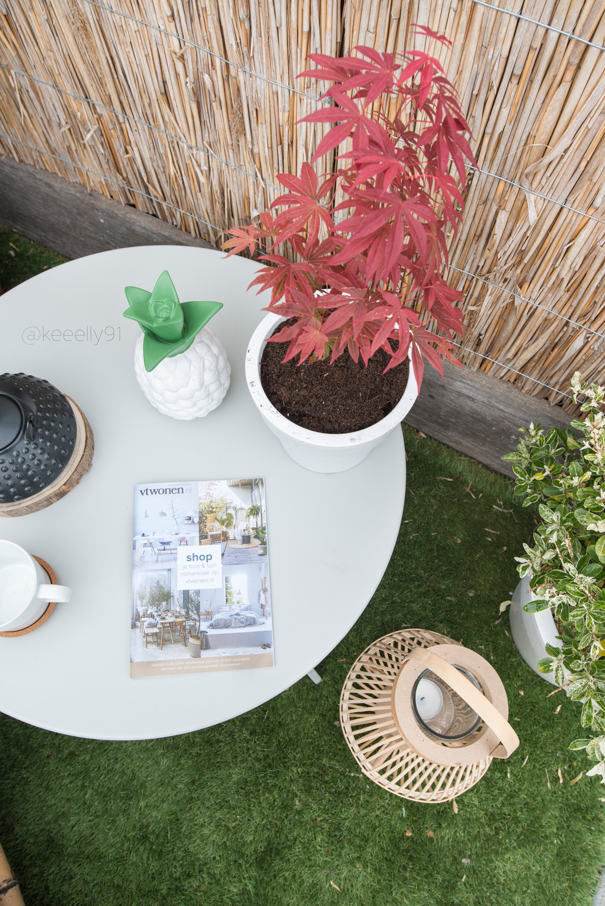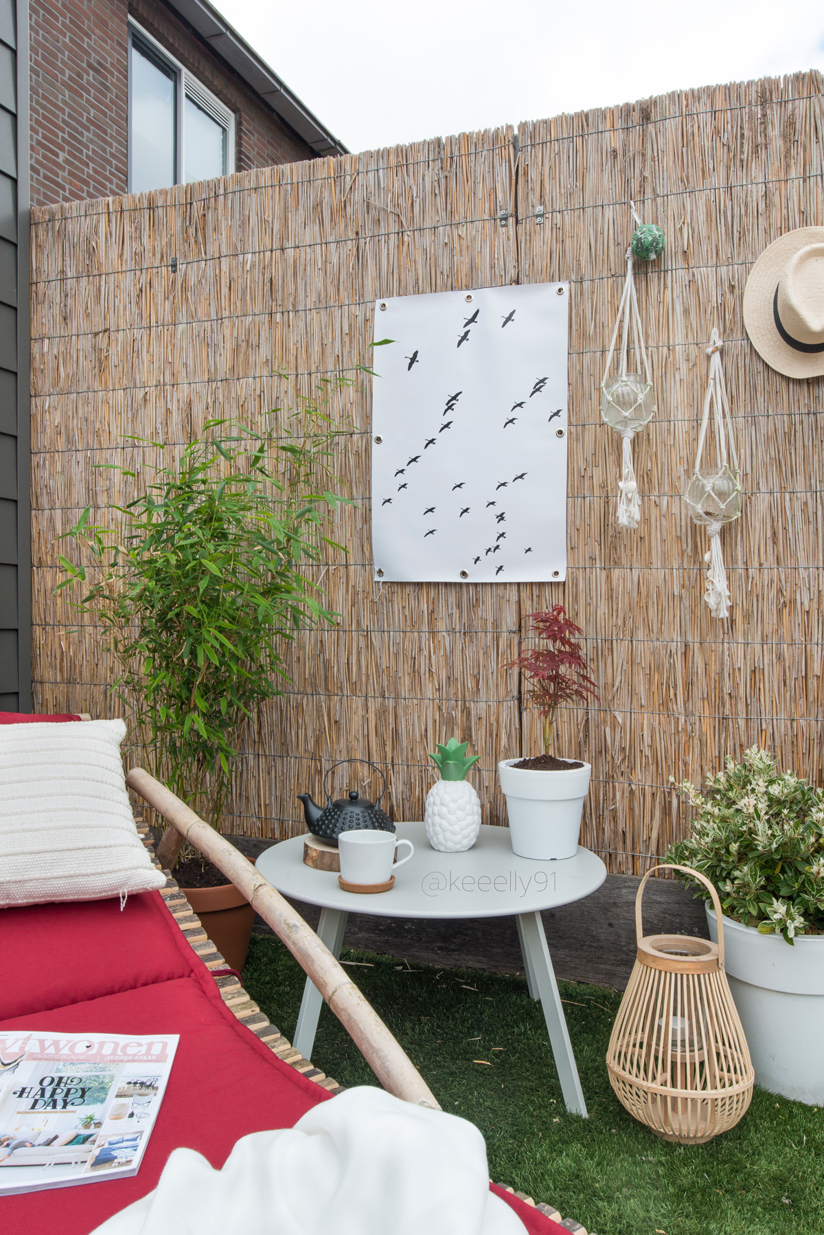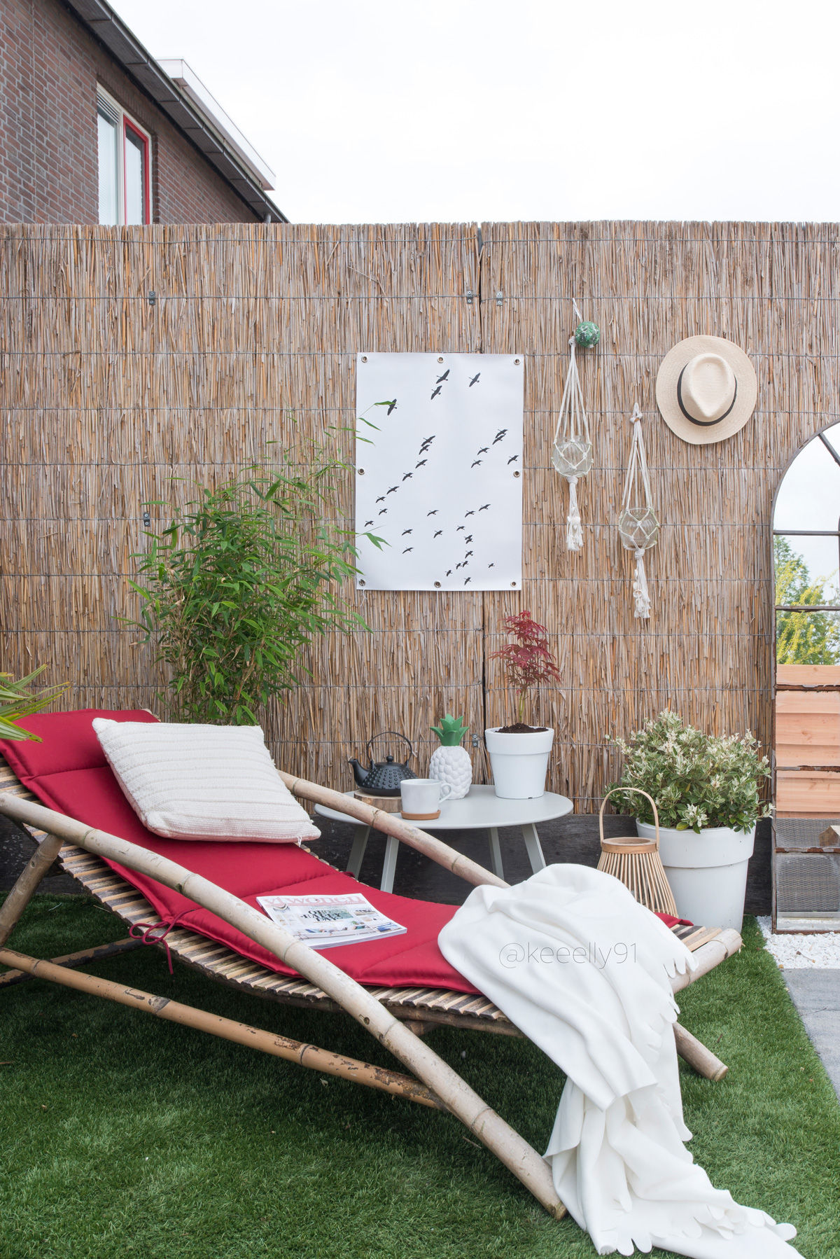 En als laatste heb ik ook het loungeplekje aangekleed. De bamboe ligstoel hadden we vorig jaar al gekocht. Alleen zonder kussen kreeg je toch een beetje een bamboe kont . Ook het bijzettafeltje is nieuw en geeft een huiselijke sfeer.