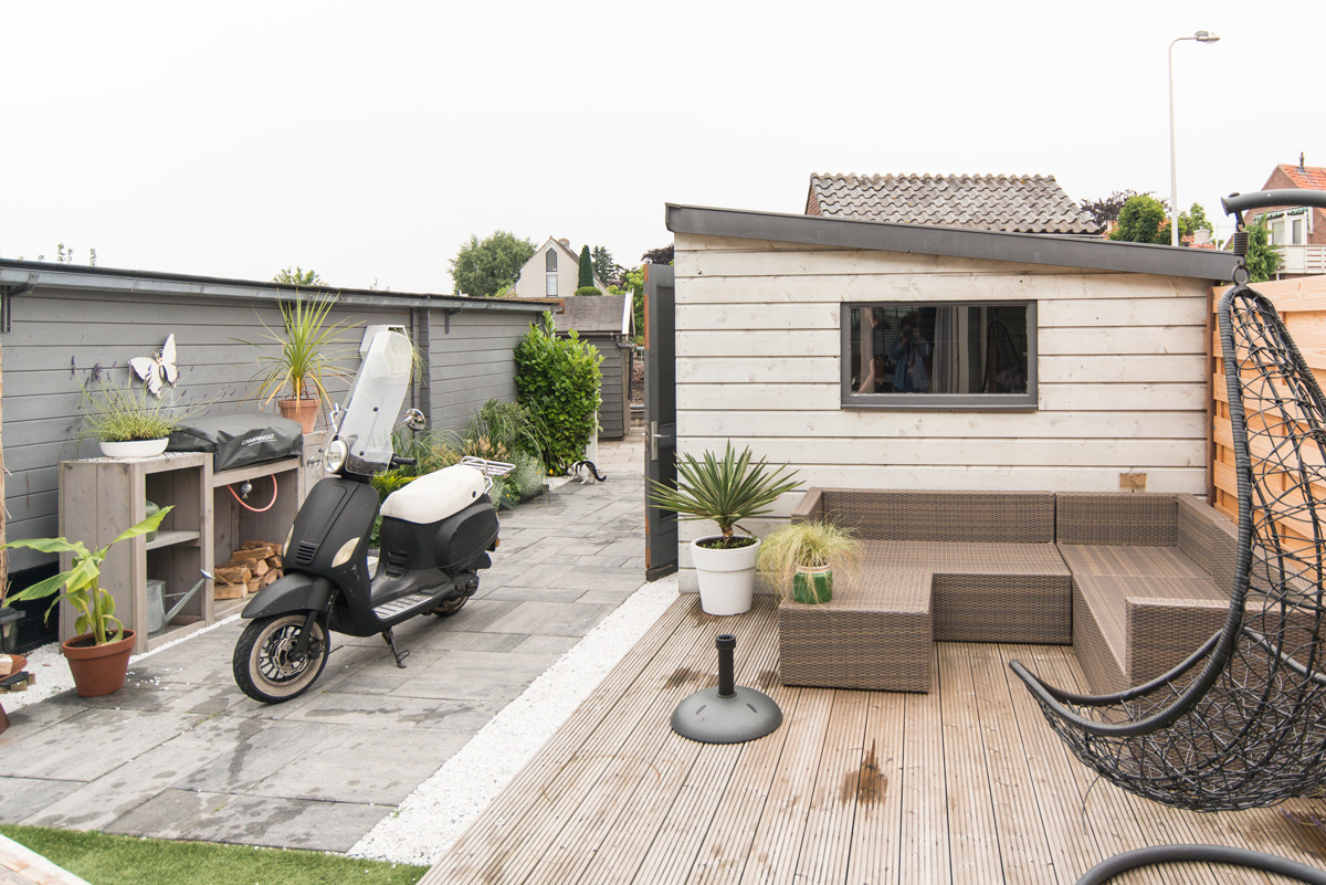 Toen we hier gingen wonen was er niks in de tuin. Ook geen schuur. We hadden dus alle ruimte om zelf de indeling te maken. Op dat moment hadden we allebei een scooter, en dus moest er een grote schuur komen. Nou oke, dat doen we wel ff! De schuur van 5 meter bij 3 werd in elkaar getimmerd en tot vorig jaar waren we daar erg blij mee.
