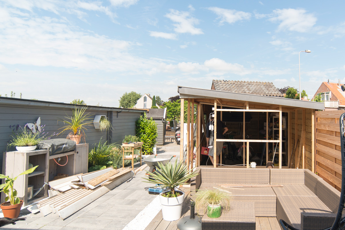 Toen kwam daar de aanbouw en slokte 2,5 meter van onze tuin weg. Opzich prima, aangezien we nog 9,5 meter tuin over hebben. Alleen ons zitje was niet zo gezellig. En toen kwamen we op het geweldige idee om 2,5 meter schuur weg te halen maar het dak te laten zitten. De overkapping was geboren haha!